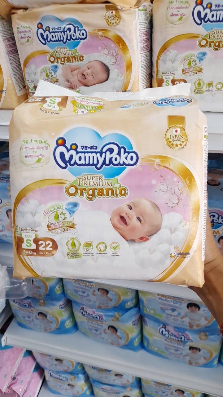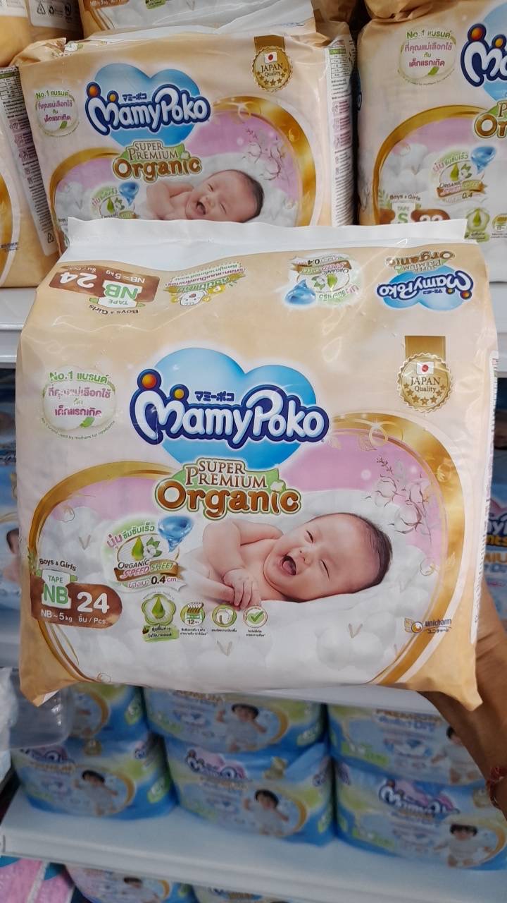 มามี่ออแกนิค NB,S ผ้าอ้อมสำเร็จรูปแบบเทปสำหรับเด็กแรกเกิด (Newborn) จากยี่ห้อ MamyPoko ที่ผลิตจากวัสดุออร์แกนิค ทำให้มีความอ่อนโยนและนุ่มเป็นพิเศษต่อผิวทารกแรกเกิด